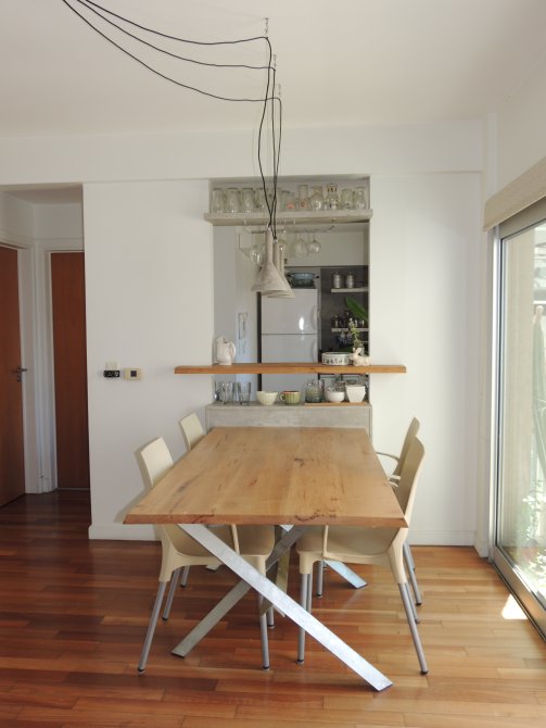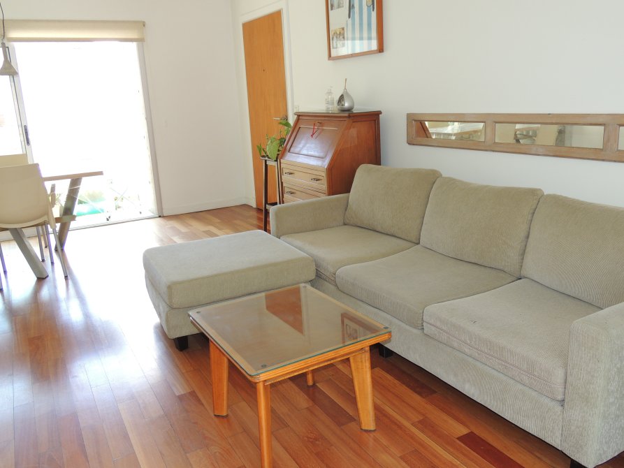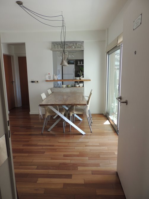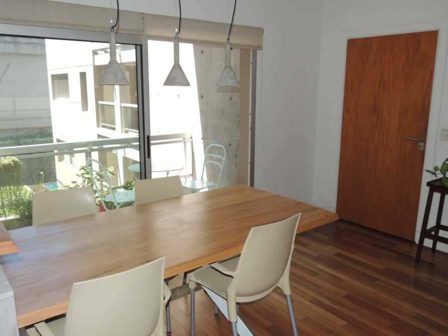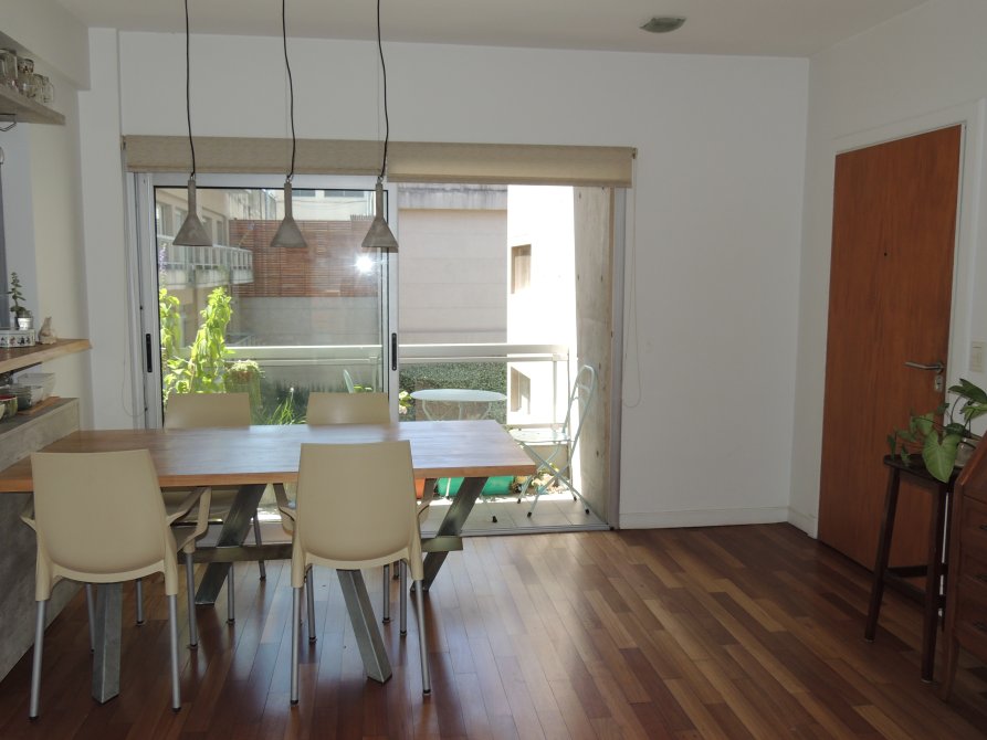 LIVING COMEDOR. De 7,50 mts por 3,80 mts. Piso de madera en tablas de 0,10 mts por 1 mts. hidrolaqueado. Dos (2) balcones, uno semi cubierto con orientación “este” hacia parque con piscina interior y otro del tipo “francés” hacia el oeste sobre el parque privado del complejo “Plaza de la Imprenta” .