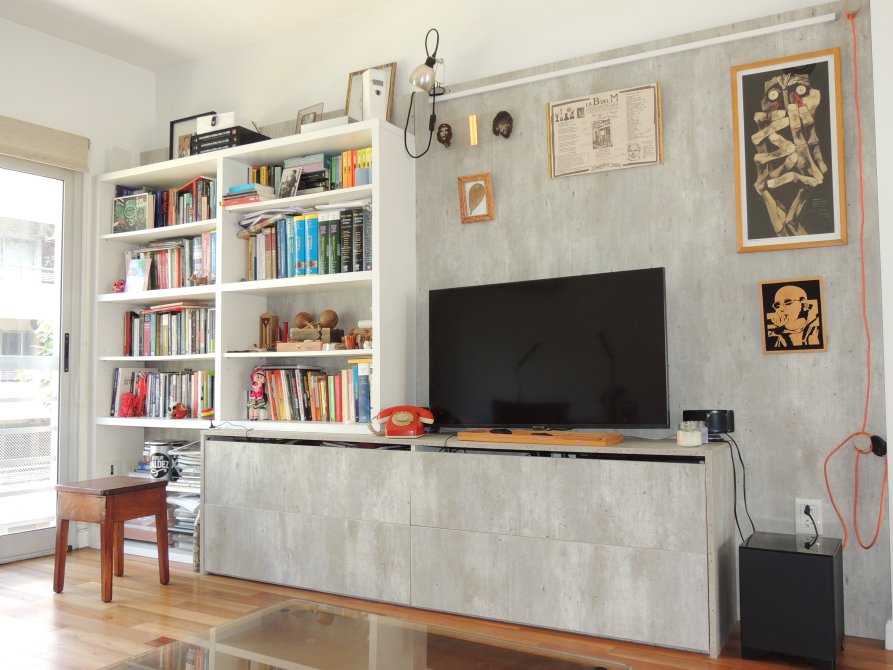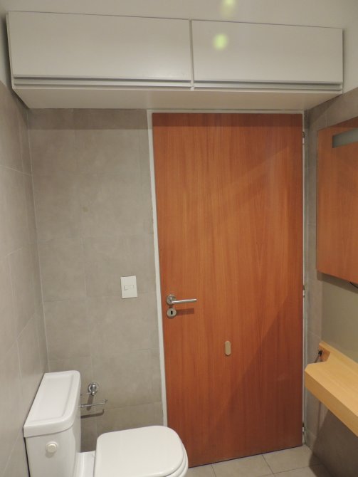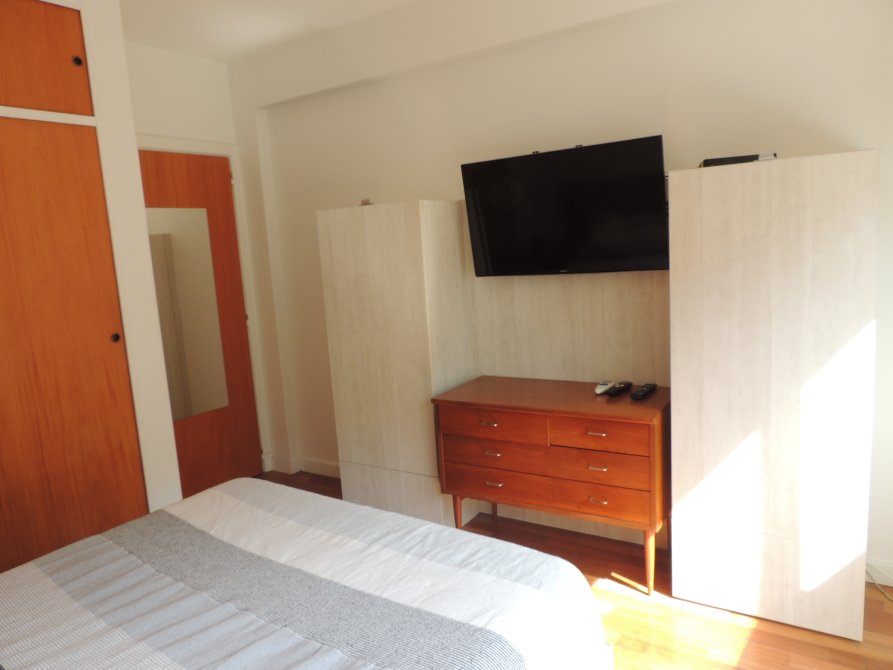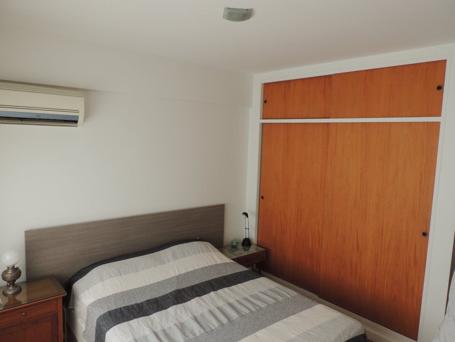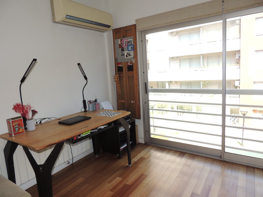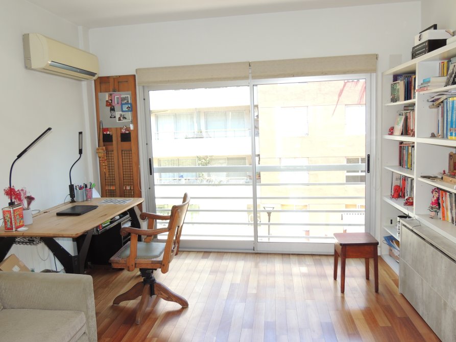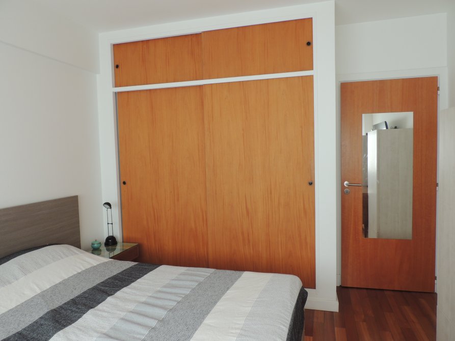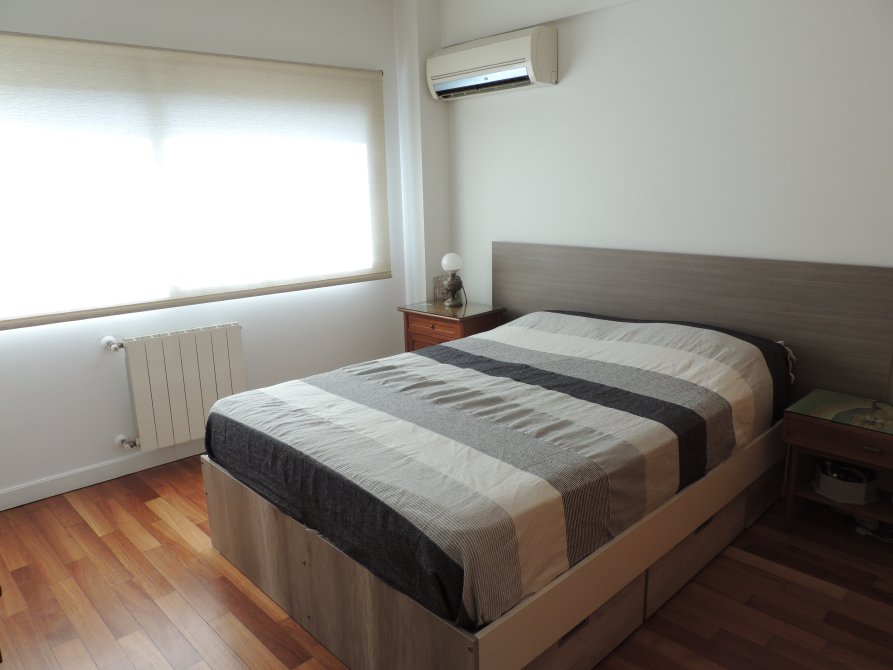 DORMITORIO. De 3,45 mts por 3,05 mts con placard piso techo. de 2,20 mts por 0,60. Piso de madera en tablas de 0,10 mts por 1 mts hidrolaqueado. Ventana de 2,50 mts de largo por 1,20 mts de alto, orientado hacia el oeste. Vista al parque privado del complejo “Plaza de la Imprenta”
