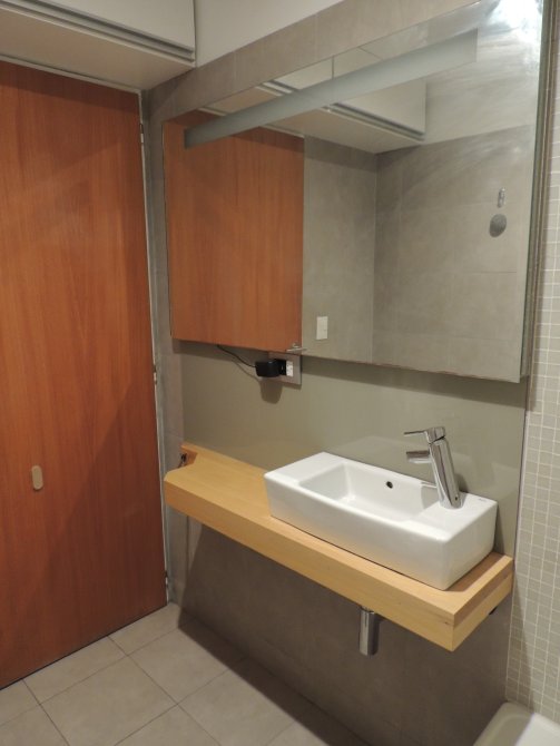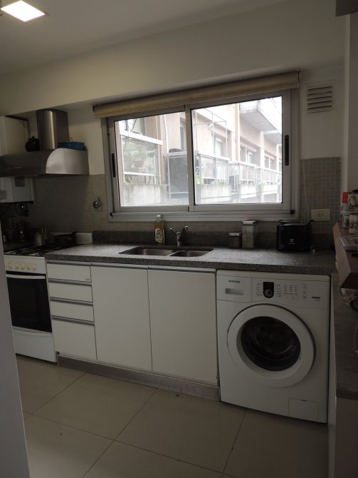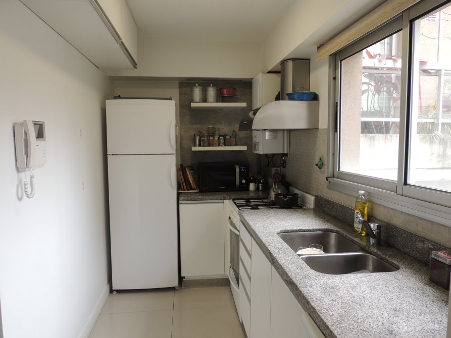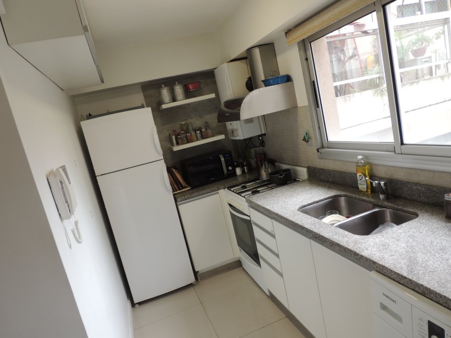 COCINA. De 1,70 mts por 3,30 mts. Ventana de 1,60 mts. por 1,00 mts.hacia el este con vista alparque interior y piscina. Piso de porcelanato y revestimiento de venecitas. Con campana extractora hacia el exterior. Muebles en MDF con revestimiento en melamina blanca y mesada de granito.