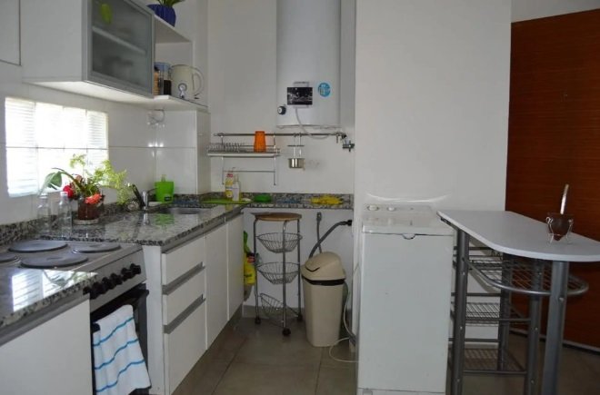 Cocina integrada. Amoblada con bajo y alto mesada. Mesada de granito , cocina eléctrica con 4 hornallas y horno en perfecto estado. Termo eléctrico grande. Espacio y conexión para lavarropas.