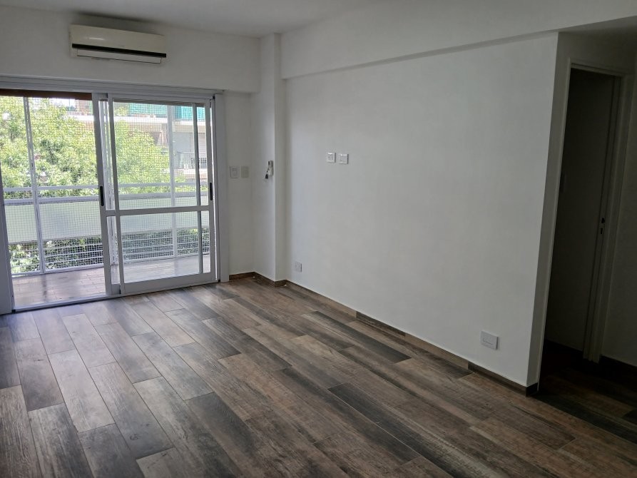 Living de 5 x 3 con piso cerámico simil madera, con ventana balcón en DVH y persiana de madera automatizada.